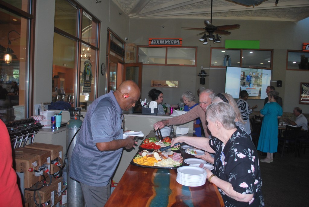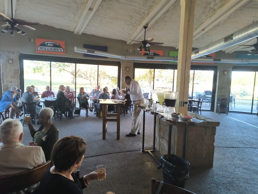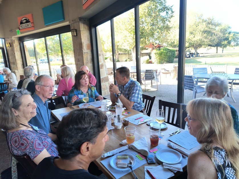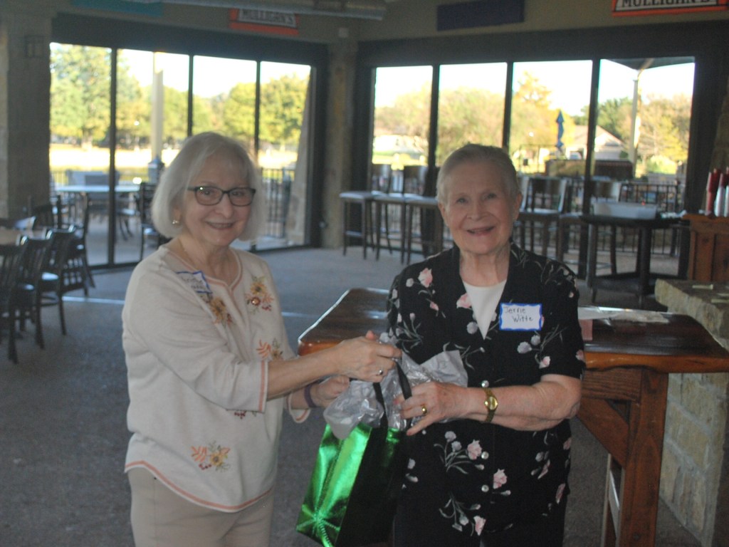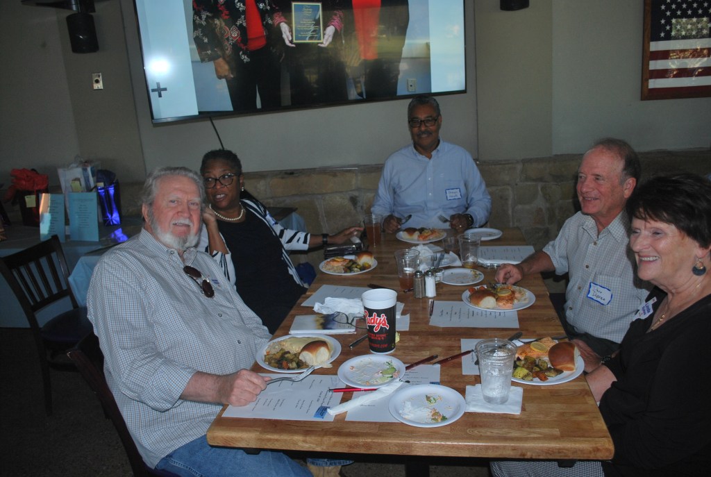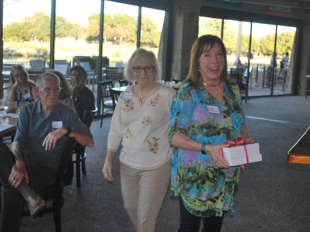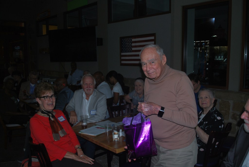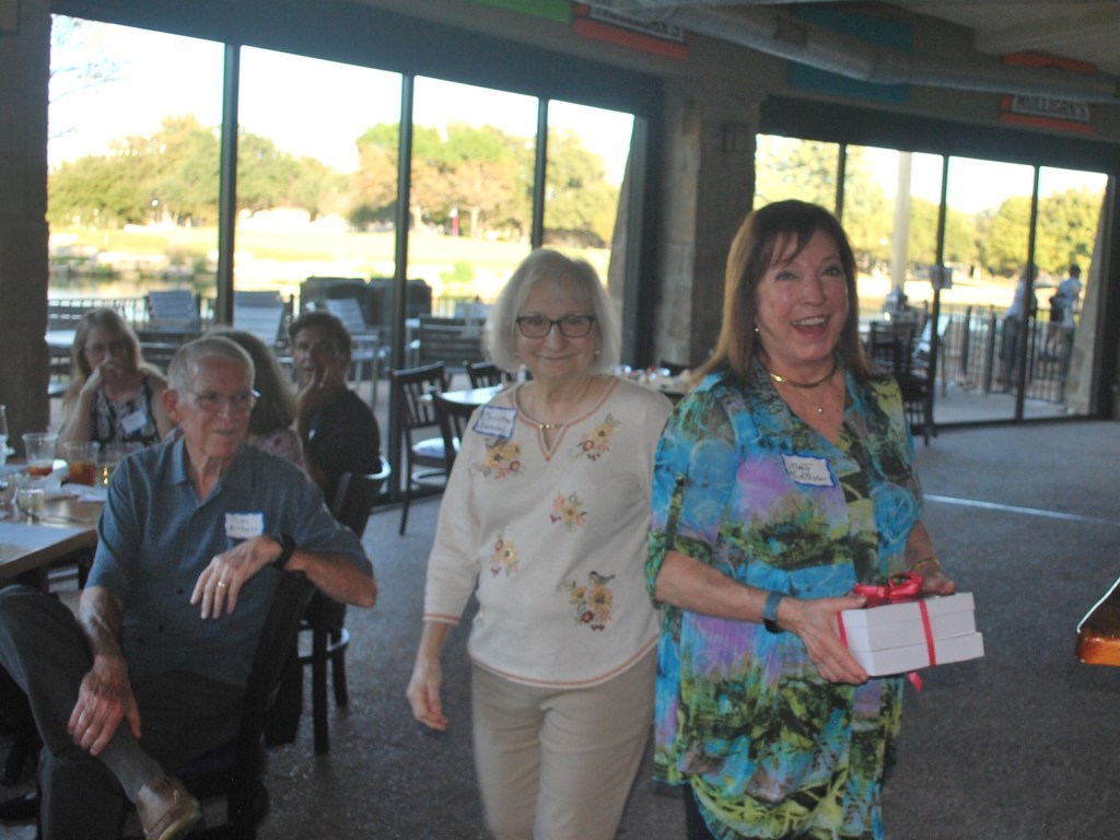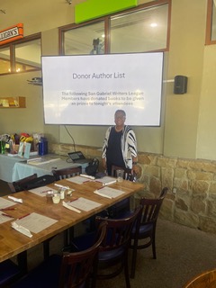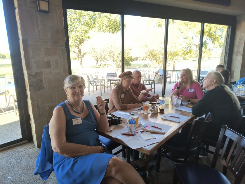 The 35th Anniversary Dinner for the San Gabriel Writers’ League took place on Sunday, October 20 on the Patio at Mulligan’s Restaurant in Sun City. This milestone event featured good food, fellowship and fun! All attendees received a 35th Anniversary commemorative pen. Fifteen Door Prizes valued at over $1,000 included gift cards and certificates from Georgetown businesses, books by SGWL Authors and a 2025 SGWL Family Membership. These items were distributed in three raffles throughout the evening.